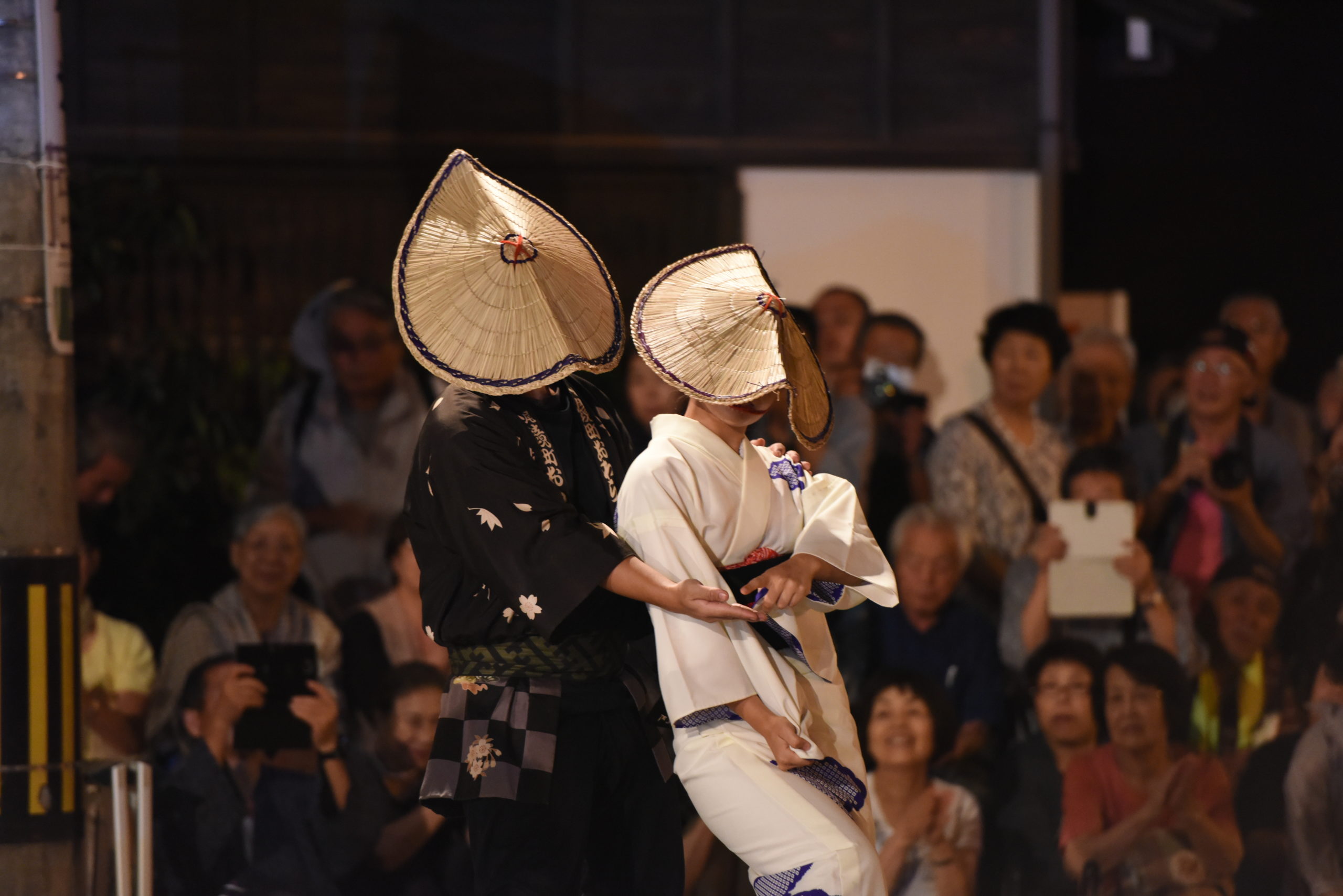 昔の面影を残す街並に明かりがともる頃、どこからともなく聞こえてくる三味線、太鼓、胡弓の音、それに合わせて哀調をおびた唄声が流れはじめると、街道から路地裏から踊りの列が舞い揃う。ぼんぼりとまん幕で彩られた街に編笠の波が流れてゆく。「唄い手」「囃子方」「太鼓」「三味線」「胡弓」のそれぞれがおわら節独特のハーモニーを奏で、「踊り手」はそれに合わせ町中を踊り歩く。